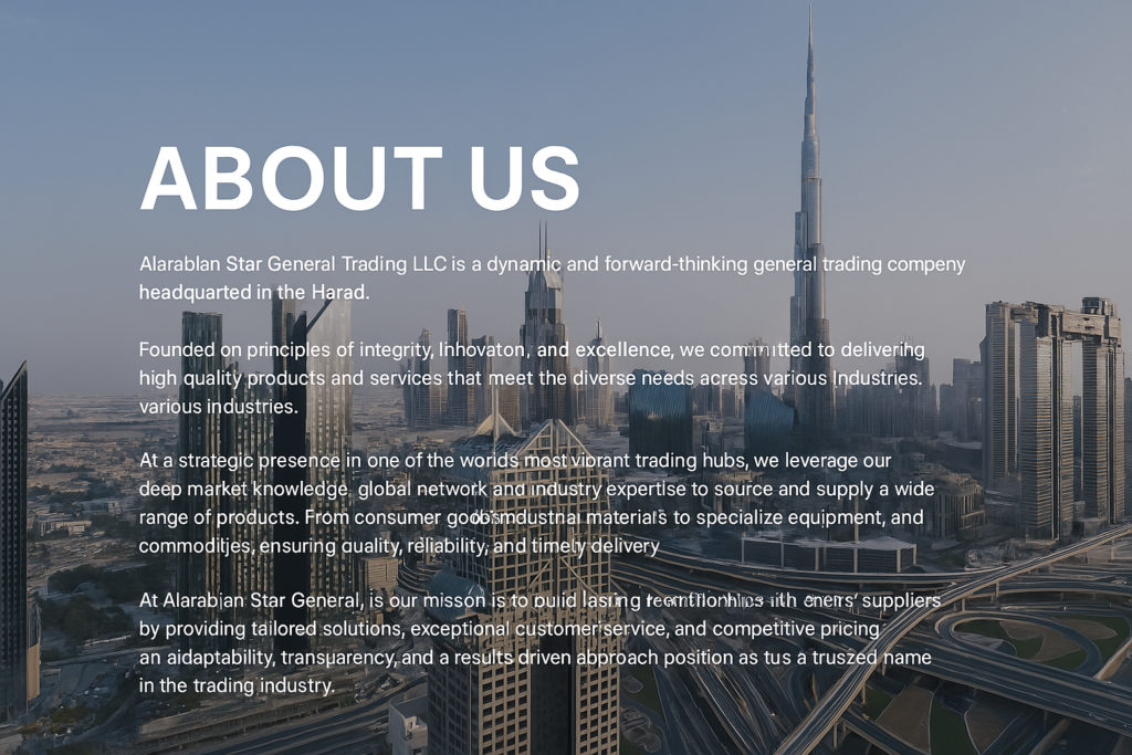 is a dynamic and forward-thinking general trading company headquartered in the United Arab Emirates. Founded on principles of integrity, innovation, and excellence, we are committed to delivering high-quality products and services that meet the diverse needs of our clients across various industries.